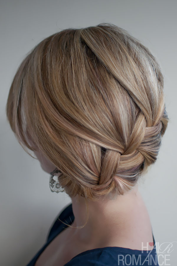 The hair was brushed back lightly off the face to drape over the ears in a soft sweep. Then an unusual diagonal braid was created covering the back of the head. The loosely woven braid creates large links in the hair and a touch of casual volume. The braid finishes at the other side of the head forming a trendy, asymmetric back view.