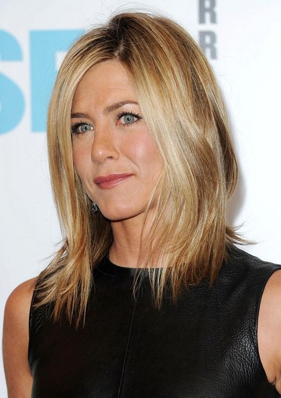 Celebrity medium length straight hairstyle for women: Jennifer Aniston styled her shoulder length locks in a textured hairstyle at her new fragrance launch.