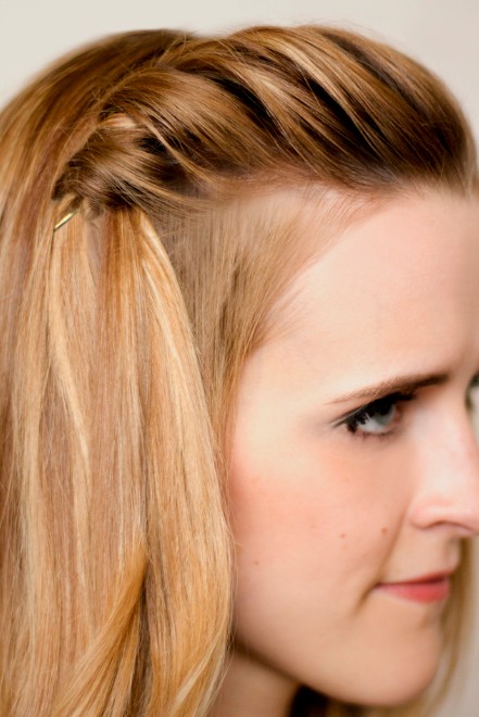 The twist is one of the two ways I know to braid two strands. The other is the herringbone. Note that if you are doing the twist as a classic or a crown, you can choose to add hair to just the bottom side of the braid. To start, take two pieces and twist one over the other. Add a piece of hair to the bottom section, and twist again.