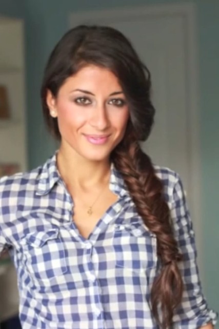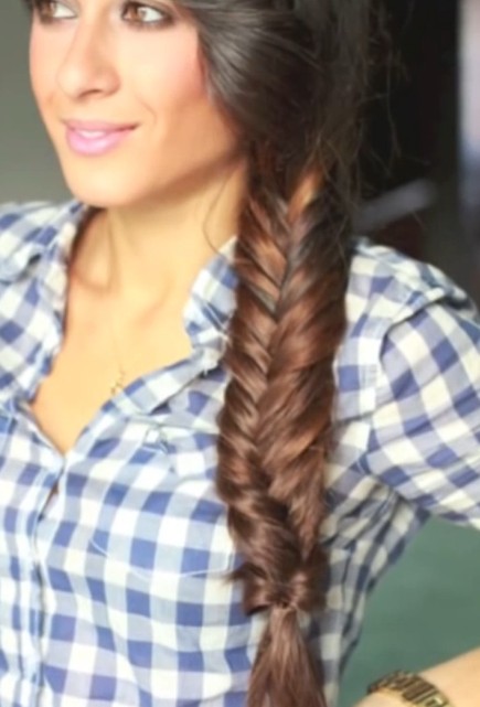 Every time I’m watching TV or going through magazines, braids are like, super, super hot right now. So, I thought i would share with you another one of my favorite braids, which is a very wearable fishtail braid. I know most of you girls would probably agree with me that a conventional fishtail braid takes forever to do. It can take like, fifteen or twenty minutes, especially if you have long hair because you have to take small sections, bring it over, bring it over.