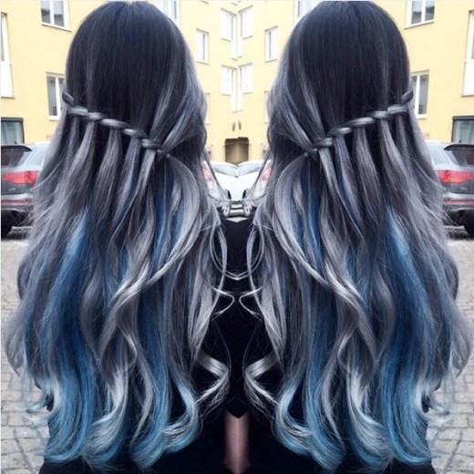 This hairstyle is a trendy trio that’s oozing with seductive shades! A black base is lightened on the ends with sultry greys and vibrant blues, hues that are a delightful blend of mystery and exotic attitude. The cascading braid separates a straight top half from loose ringlets below, creating a marvelous style that’s as flawless as it could get. So in love with this fab ‘do!