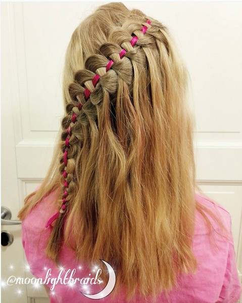 Super cute for younger girls, and a great way to shake things up a bit. Adding just a single ribbon to interlock with your waterfall braid is such a cool and cute way to spice up your look with some color. Any color will do- mix and match to suit your style!