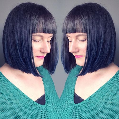 Charcoal-gray bob hairstyles with bangs and chic indigo-blue shimmer