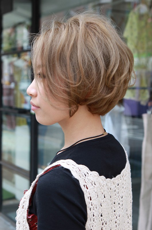 The basic haircut is an asymmetrical bob with the hair blunt-cut to a face-flattering length just below the jawline. There is an off-centre parting and the front hair was blow-dried to curve back towards the ears, forming very attractive contrast with the rest which is curved forwards.