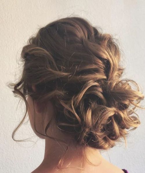 This contemporary updo is another new technique we haven’t seen ever before. Hair is looped and twisted and pinned to create a lovely series of knots and swirly texture decorating the back of the head. The mixture of three glossy golden shades creates 3-D color depth and loose strands keep the look semi-formal and relaxed.