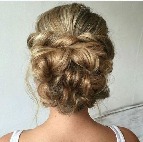 Smoothed back from the forehead, with flat-braid details at the sides, this ultra-trendy updos’ idea is a real show-stopper! The cascading flounce of blonde-swirls adorning the back is a great example of how asymmetry and messy chaos, are actually quite beautiful and artistic! With several blended blonde shades, this is one of the ‘designer’ updos for 2017!